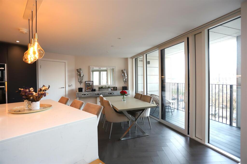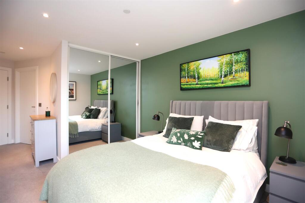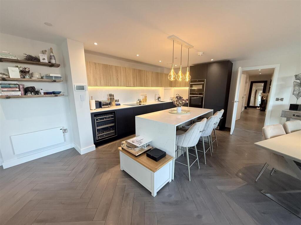 The apartment benefits from a private balcony with water views, a high-spec modern kitchen with integrated appliances, and two well-proportioned bedrooms with fitted wardrobes. Both the bathroom and ensuite are finished to a luxurious standard with designer sanitary ware and premium fittings.
