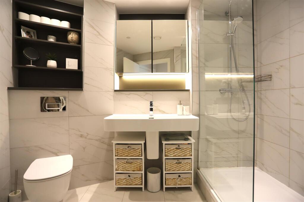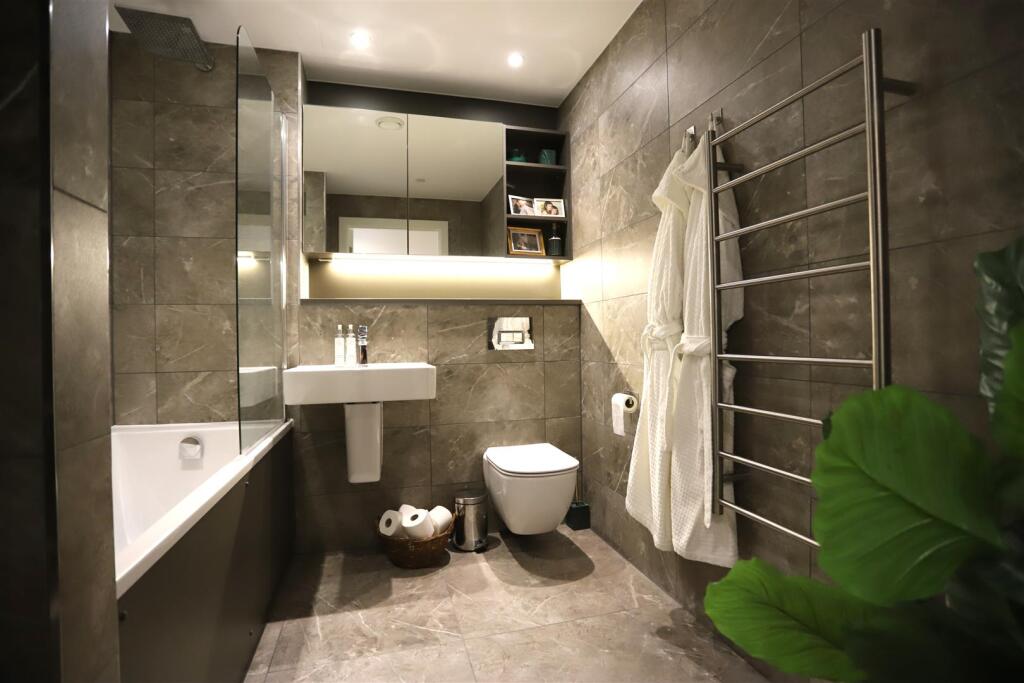 The bathroom and ensuite have been thoughtfully designed to reflect the apartment’s refined aesthetic. Contemporary sanitary ware from Italian designer Sottini is complemented by Hansgrohe taps. Marble-effect Vitra Marmori tiles to the walls and floors enhance the sense of luxury, alongside a Hansgrohe Crometta rain shower and a bespoke vanity unit with mirror and shaving point, creating a stylish and tranquil environment.
